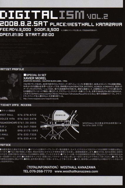 管理人様告知失礼します。 DIGITALISM vol.2 2008.08.02sat OPEN/START:22:00 SPECIAL DJ SET XAVIER MOREL (RASPUTIN RECORDS/SOLSTICE BLACK LABEL/FRA) DJ’s CUBIC (PUZZLE NETWORK) YU (Rhythmic Moon) YOCCI (Rhythmic Moon) DAI (BASIC WAVE) and more... Profile XAVIER MOREL (RASPUTIN RECORDS/SOLSTICE BLACK LABEL/FRA) 1976年フランス生まれ。80年代前半のエレクトロニ