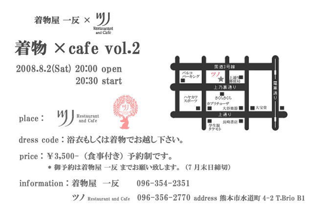 皆様こんにちは 先日掲載しておりました、 イベントの詳細が決定しましたのでお知らせいたします 『着物×cafe vol.2』 会費:¥3,500予約制(食事付) 問い合わせ:着物屋 一反 ?0963542351 ツノ Restaurant and Cafe ?0963562770 ※浴衣もしくは着物でお越し下さい ※御予約は7月末日までに着物屋 一反(?0963542351)へ、 もしくは私、一反にメッセージをお願い致します フルネーム・御連絡先(複数の場合は人数分) をお書き込みの上、ご連