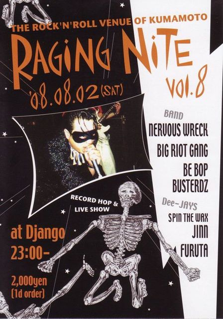 RAGING NITE vol.8 2008/08/02 (sat) @Django open.23:00~ ticket 2,000yen+1drink order BANDS NERVOUS WRECK (fukuoka) BIG RIOT GANG BE BOP BUSTERDZ Dee-Jays SPIN THE WAX JINN FURUTA 今回のRAGING NITE vol.8は、自主レーベルPHANTOM RECORDSより7インチレコード 「MUNSTERS VOID」をリリースしたNERVOUS WRECKが福岡より登場!! HARD CORE 50's 畸形ロカビリーと称しlate 50's〜early60'sのR'N'Rを基調とした オリジナリティー溢れるサウンド、見る者全てを惹きつける圧倒的な ライヴパフォーマンス
