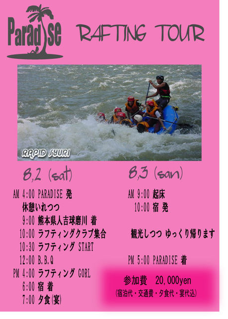 ラフティングにいくよ 8月2日(土) AM 4:00 PARADISE 発 休憩いれつつ 9:00 熊本県人吉球磨川 着 10:00 ラフティングクラブ集合 10:30 ラフティング START 12:00 B.B.Q PM 4:00 ラフティング GORL 6:00 宿 着 7:00 夕食(宴) 8月3日(日) AM 9:00 起床 10:00 宿 発 観光しつつ ゆっくり帰ります PM 5:00 PARADISE 着 参加費:20,000yen (宿泊代・夕食代・宴代込) 限定15名 多数の参加お待ちしております。