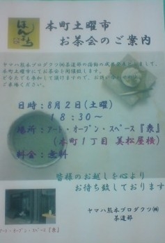 ヤマハ茶道部『土曜市』お茶会のご案内 ヤマハ熊本プロダクツ?茶道部の活動成果としまして やつしろ本町商店街『土曜市』にてお茶会を開催致します。 どなたでも参加できますので、お誘い合わせの上 お気軽にご来場ください 日時 : 8月2日(土) PM18:30〜 場所 : アート・オープン・スペース 『衆』 (本町1丁目) 料金 : 無料 お菓子がなくなり次第終了になりますので、お早めにおこし下さい。 不明な点がありましたら、ネールにてお問い合わせ下さい。 皆様のお越しをお待ちしており
