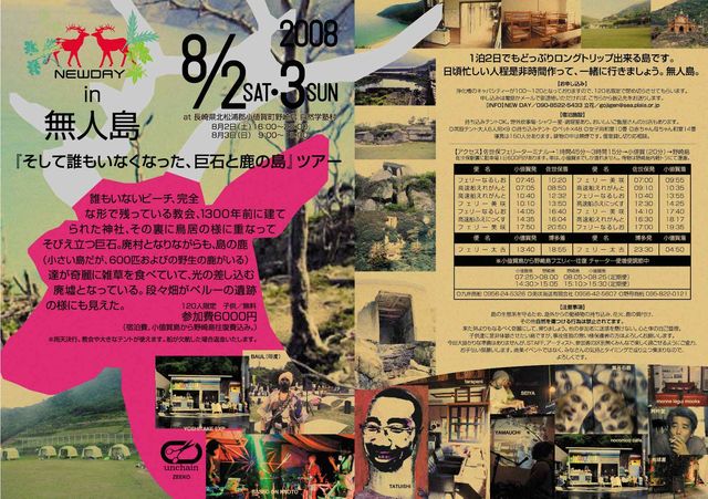 8/2、3NEWDAYの会場となる『野崎島』 は、20世紀をやっと振り返えれるようになった(そうせざるをえなくなった) 僕たちに強烈なメッセージを発する島です。 島には廃校になった小学校を利用し、自然学習塾という宿泊施設(キャンプ可)があり、素晴らしい真っ白な誰もいないビーチ、完全な形で残っている教会、1300年前に建てられた神社、その裏に鳥居の様に重なってそびえ立つ巨石。港付近には廃村となりながらも、島の鹿(小さい島だか、600匹およびの野生の鹿がいる。人間になついて無い為、鹿によるキャンプ被害は心配ない)