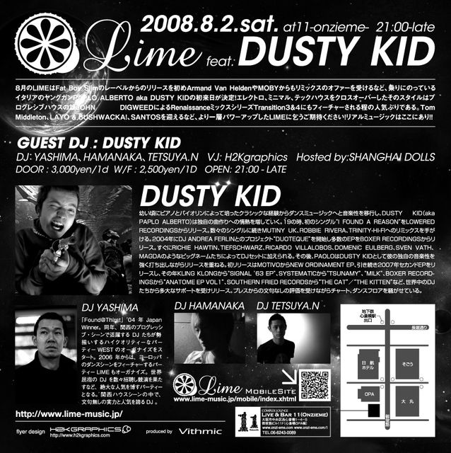 8月のLIMEはFat Boy Slimのレーベルからのリリースを初めArmand Van HeldenやMOBYからもリミックスのオファーを受けるなど、乗りにのっているイタリアのヤングガンPAPLO ALBERTO aka DUSTY KIDの初来日が決定!エレクトロ、ミニマル、テックハウスをクロスオーバーしたそのスタイルはプログレシブハウスの雄JOHN DIGWEEDによるRenaissanceミックスシリーズTransition3 &4にもフィーチャ