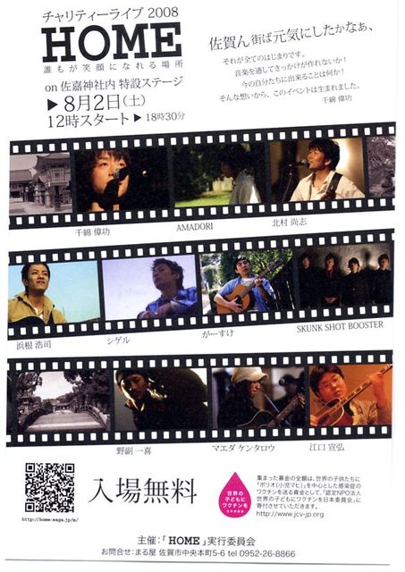 “佐賀ん街ば元気にしたかなぁ” それが全てのはじまりです。 音楽を通してきっかけが作れないか! 今の自分たちに出来ることは何か! そんな想いから、このイベントは生まれました。 千綿偉功 チャリティーライブ2008『HOME』〜誰もが笑顔になれる場所〜 “世界の子供たちにワクチンを送ろう” ◇日 時:2008年8月2日(土) 正午12時 開始(予定) 〜 午後6時45分(予定) <当日のタイムスケジュールにより開始及び終了時間が多少前後する場合があります> ◇会 場:佐嘉神社内特設ステージ ※入場は無料です。