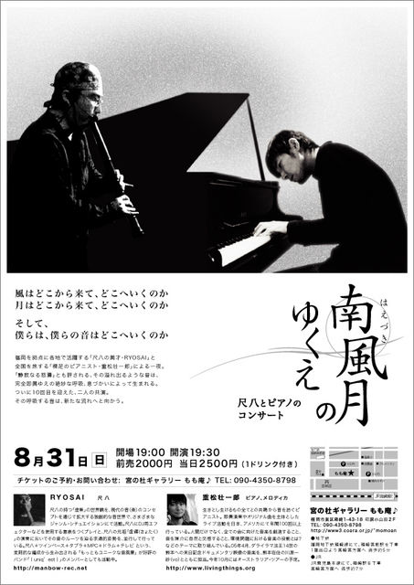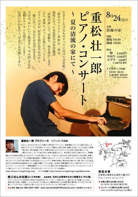 今年で5度目となる、恒例の夏のツアーを行います。 それぞれいろんな企画でお楽しみいただけます。 みなさま、ぜひともお越し下さい! ━━━━━━━━━━━━━━━━━━━━━━━━━━━━━━━━ ★重松壮一郎 夏の全国ツアー「夏旅2008」 http://www.livingthings.org/08summer .................................................................................................................. 8/02(土) ギャラリー花伝(佐賀・有田) 8/08(金) カフェスローOSAKA(大阪・十三) 8/10(日)