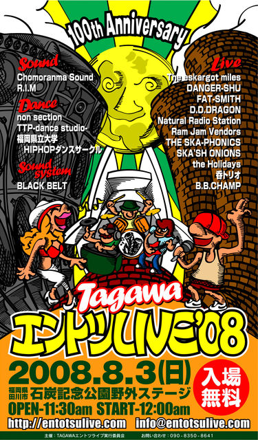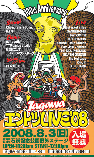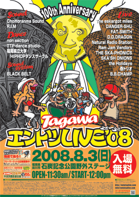管理人様、告知失礼します。 今年で4回目を迎える「TAGAWAエントツライブ」。 今回は、東京都内を中心に活動し、全国各地の出演イベントを大盛況にしている『The eskargot miles』をスペシャルゲストに迎え、2007年メジャーデビューを果たし、レゲエフェスなどライブの強烈な盛り上がりが評判の『Natural Radio Station』や、九州を代表するレゲエクルー「Chomoranma Sound」のDJ『DANGER-SHU』、『FAT-SMITH』、『D.D.DRAGON』が勢ぞろい。更に、日本全国から選りすぐりのオーセンティック・スカ&ロック・ ステディ・バンドが一堂に会する一大