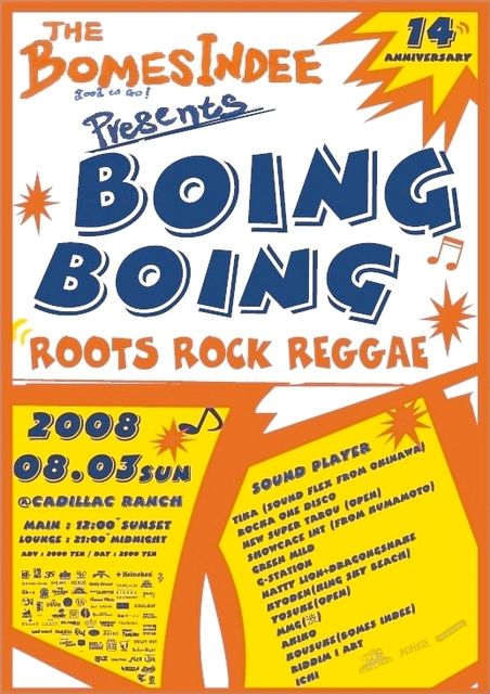 昨年から糸島ではじめたBOMES INDEEのAnniversaryを今年もやることが決定しました。梅雨明け一発目の8月3日(日曜日)に昨年もお世話になった糸島野北海岸のキャデラックランチでやります。今年は昨年の経験を活かしてもっといいDANCEにできるようにしたいと考えてます。皆さんお忙しいとは思いますが予定をあけといて頂けたらと思います。家族、子供、友達、彼氏、彼女、爺ちゃん、婆ちゃん、犬、猫、などと一緒に青い海と空の下でビール片手にROCKING TIME!! お待ちしてます。 (BOMES INDEE) BOING BOING BOMES INDEE 14TH ANNIVERSARY
