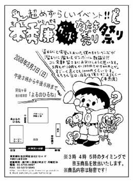 超めずらしいイベント!! 資料にと保管しておいた僕のキャラグッズが溜まりに溜まって段ボール数箱分!!コレ全部皆様にお分けしようと思います。 1円とか10円とか100円とか500円とか。すごーく高くても1000円くらいです。 もちろん当日、店主は僕です!!よろしくー(本秀康) ※3時 4時 5時のタイミングで目玉商品を放出いたします。 商品内容は秘密です!! 阿佐ヶ谷よるのひるね 阿佐ヶ谷北口ロータリー左側不動産や角曲がる郵便局の十メートル奥 03-6765-6997 yoruhiru@jcom.home.ne.jp http://members.jcom.