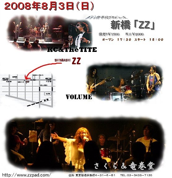 8月3日(日) ダディ竹千代プロデュース 新橋 Live Music & Bar 「ZZ 」 http://www.zzpad.com/0808.html KC&TheTITE VOLUME さくら&竜巻堂 スペシャル司会者:ダディ竹千代 氏 爆音&ソウルナンバー の三つ巴特濃ライブ さくら&竜巻堂は、新ネタ&新アレンジの曲も引っ提げて 手加減ナシのマキ&OZナンバー、かましちゃいます。 オープン17:30 スタート18:00 前売り¥1500 当日¥2000 こちらのイ