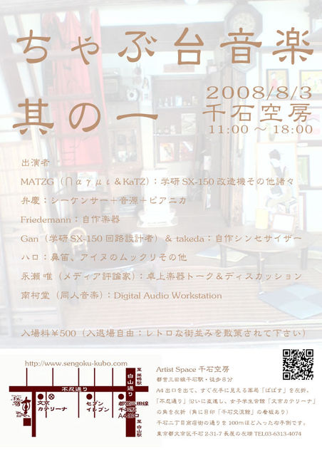 新企画「ちゃぶ台音楽 其の一」 千石空房オーナーKaTZです。 昭和の佇まいが売りの空房には昔ながらのちゃぶ台がありまして、 DTMならぬCTM(Chabudai Top Music)が実現可能である事に気が付きました。 DTM(Desk Top Music)はDTPをもじった和製英語らしいですが、 和にこだわるのであれば、やはり「Chabudai」です。 って訳で2008年8月3日「ちゃぶ台音楽」を始動させたいと思います。 個人の趣味的に電子楽器&手作り楽器を中心に考えておりますが、 口琴等のナチュラルなパフォーマンスも歓迎します。 お気楽な楽器好きの情報交換・交流