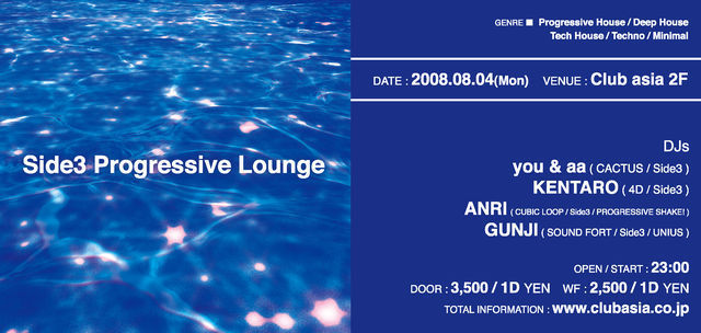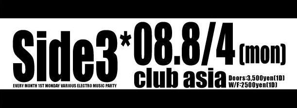-EVERY MONTH 1ST MONDAY- VARIOUS ELECTRO MUSIC PARTY ∈Side3∋×ALL RESIDENT 2008年8月4日(第一月曜日) @club asia(渋谷) OPEN/START 23:00〜 Doors:3,500yen(1D) 【MAIL DISCOUNT】 ¥1500 or ¥2000 23時〜1時までにご入場の方は¥1500。それ以降は¥2000となります。 ※ディスカウントは「ディスカウント希望者全員のフルネーム」を明記の上、連絡してください。 エントランスにて「メールディスカウントで○○」と伝えた後にIDと本名を照合いたします、ニックネーム又は偽名は使えませんのでご了承願いま