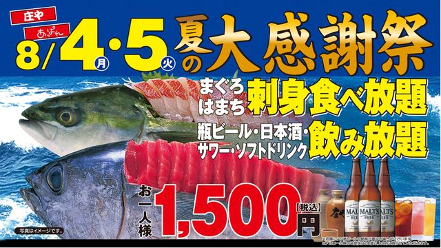 え〜。。。 お暑い中みなさんご苦労さまデス!! 今年も。。。 この季節がやってきました!!! 『庄や〜夏の大感謝祭〜』デス☆ 昨年は急にも関わらず大好評で、 「まぐろキャンセル待ち」という、 伝説が生まれた程デス。。。(ノ∇≦*) 日頃の疲れを癒すためにも、、、 まぐろ!はまち!のお刺身を食べまくろう!! ビール!サワー!日本酒を飲みまくろう!! 2000円以下で!!(^ω^) 刺身とお酒で「スキマ」を埋めたい、 スキマ時間のある方!! 奮ってご参加下さい♪ 【日時】 8/4(月)20:0