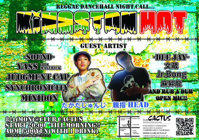 告知失礼いたします 8/4(MON) KINGSTON HOT ~RUB-A-DUB SPECIAL~ -GUEST ARTIST- TRIGA FINGA a.k.a 親指頭 たかだ☆じゅんじ -SOUND- MINIDON YASS from MAVERICK Judgement cap Synchronicity -DEE-JAY- 文蔵 Jr.BONG 麻昇龍 RUB-A-DUB OPEN MIC!! OPEN/START 20:00 ADM:\1500-1d 夏も始まり、暑い日々が続いていますが暑い夜に熱い場所で厚い音を聞きにきてください!!メッセージいただければいくらでもディスカウントするのでご連絡ください!! ◆FOOD \600〜 @Club CACTUS 港区南青山1-15-18リーラ乃