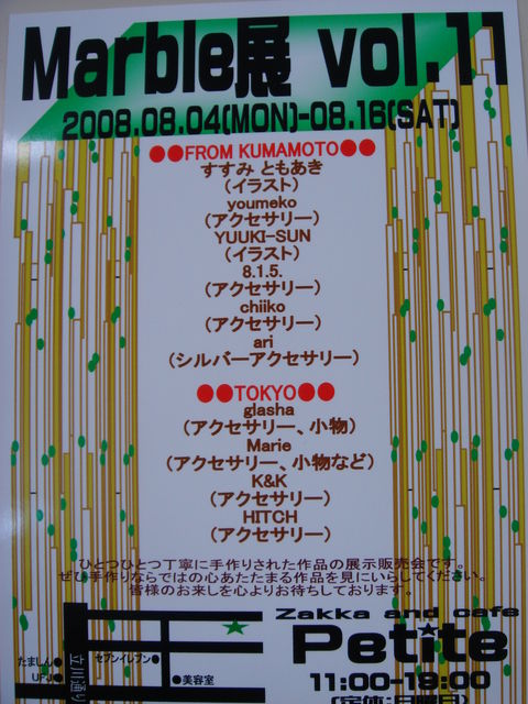 夏の暑さに負けないように8月はプティットで素敵なイベント盛りだくさん 8月のイベント第一弾!! 「Marble展 vol.11」 8月4日〜8月16日まで。 熊本から、東京から。。 総勢10人の作家さんがわいわい手作りの作品でプティットの白い壁をにぎわせてくれます! イラストやアクセサリー作品もさまざま 今から楽しみです(・v・)皆さんもぜひ遊びに来て下さい*