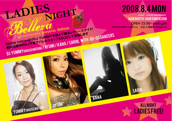 【女性入場無料!】Belleza-LADEIS NIGHT 8/4(MON) OPEN 23:00〜midnight @Club camelot http://www.clubcamelot.jp/ SYSTEM MEN:\3000/1d WOMEN:FREE(ドリンク代のみ¥1000/2D) camelotの毎月第一月曜日は、 女性DJのみでお届けする新しいレディスナイト!! なんと、女性は終日無料でご入場頂けます。(ドリンク代別途) ゲストDJにはHousenationレジデントDJのDJ YUMMYが登場! ヘアメイクはあのイケメン揃いのHAIR DIMENISON ダンサーや、スペシャルゲストもあります DJs AYUMi / KANA