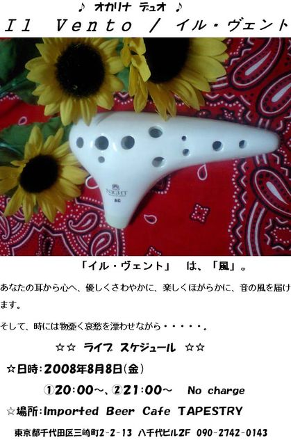 オカリナ デュオ Il Vento/イル・ヴェント 日時:2008年8月8日(金) ?20:00〜、?21:00〜 No charge 「イル・ヴェント」はイタリア語で風という意味です。オカリナはイタリア発祥の土笛で、大きさによって音域や調性が変わります。女性デュオ(オカリナ&ピアノ)が奏でる柔らかな音色をお楽しみ下さい。ジャンルは和洋東西を問わず幅広く、懐かしい曲から最近のヒット曲まで様々です。皆様がどこかで耳にしたメロディーをオカリナの演奏でお聞き下さい。 入場は無料となります。 通常の営業の一環として