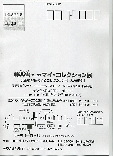 美楽舎マイ・コレクション展 8月3日(日)〜9日(土)11:00〜19:00 ギャラリー日比谷(千代田区有楽町1-6-5 TEL 3591-8948) 同時開催「サラリーマンコレクターが触れた1970年代南画廊・志水楠男」 美術愛好家によるコレクション展です。 物故作家から現代作家まで、平面はもちろん、今年は、彫刻も充実しています。 8日(金)18:00〜19:00 長谷錦一(元弥生画廊)「南画廊とその時代の証言」 9日(土)13:30〜15:00 五辻通泰(五辻画廊)「私と志水楠男」 有楽町駅日比谷口からすぐ、晴海通り沿いのレンガ色のビルです。 お時