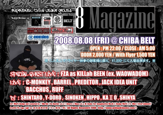 2008/8/8(金) HIPHOP,R&B 『8Magazine』 @千葉CLUB-BELT OPEN 22:00〜 SPECIAL GUEST LIVE: ■FZA as KILLah BEEN【ex.WAQWADOM】 LIVE: ■C−MONKEY ■BARREL ■PREDETOR ■JackIdeaUnit ■BACCHUS ■RUFF DJ: ■SHINTARO ■Y−DORO ■SINOKEN ■HIPPO ■KA?O ■SHINYA ENTRANCE FEE DOOR : 2,000yen W/F : 1,500yen