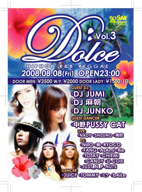 ★管理人様 告知失礼致します★ waRter presents 「Dolce」 vol.3 2008.08.08(Fri) 23:00開場 ジャンル:HIPHOP,R&B,REGGAE 2008_08_08_dolce_flyer waRterが誇る最強Girl’s Event『Dolce』!!出演者はもちろんAll Lady’s!!!DJ,SINGER,DANCER全ての女の子がキュートで甘く、妖艶で甘美な空気で会場を包み込み、Partyの虜になること間違いなし!8月8日の『Dolce』ではGUEST DJに、毎回Dolceでフロアーをガッチリロックさせてくれる「DJ JUMI」をはじめ、都内を中心に大活躍中でGirl’s EVENTのパイオニア、御存知「DJ 麻朝」&「DJ JU