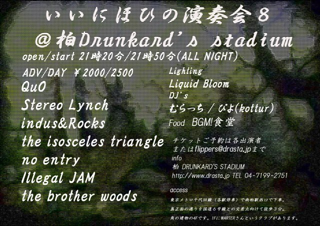 JAM BAND系イベントに参加します。 お暇な方是非是非〜。 2008.08.08.fri いいにほひの演奏会8@柏Drunkard's stadium open.21:20/start.21:50 adv. 2,000yen/door.2,500yen ■band: QuO http://mixi.jp/view_community.pl?id=103142 http://profile.myspace.com/index.cfm?fuseaction=user.viewprofile&friendid=1000629337 Stereo Lynch http://mixi.jp/view_community.pl?id=136859 http://www.myspace.com/stereolynch indus&Rocks http://mixi.jp/view_community.pl?id=1555519 http://www.myspace.com/indusand