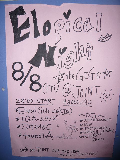 千葉ジョイントにて 8月8日 金曜日 ELOPICAL NIGHT THE GIGS !!!!!! DOOR 2000/1D LIVE START 22:00~朝方まで。。。。。 場所など詳しくは http://mixi.jp/view_bbs.pl?id=33415510&comm_id=80000 ViVA !!