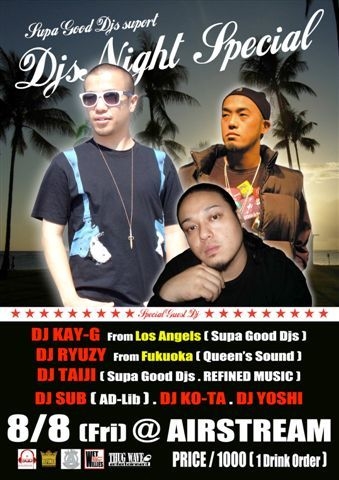 いよいよ明日に迫りました,SUPA GOOD DJ'S &AIRSTREAM_PRESENT'S,,, DJ'S NIGHT SPECIAL!!!!! 今回SPECIAL GUESTとしてSUPA GOOD DJ'SのメンバーのDJ KAY-G氏(from LA),親富孝レコード店QUEEN'S SOUNDからDJ RYUZY氏を迎えたSPECIALなイベントとなってます!!! お時間のある方は是非遊びに来られて下さい★☆★ Supa Good Djs & AIRSTREAM PRESENTS,,, 【DJ'S NIGHT SPECIAL!!!!!】 8/8 Fri @AIRSTREAM Price \1,000 (1Drink Order) ●SPECIAL GUEST DJ DJ KAY-G(Supa Good Djs)from L.A DJ RYUZY (Queen's Record)from FUKUOKA DJ TAI