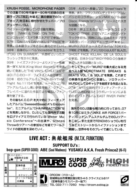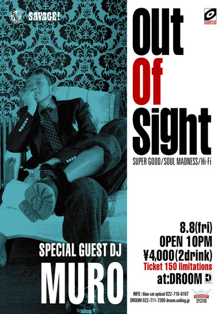 管理人様、パーティの告知失礼致します。 title:Out of Sight Special Guest DJ MURO with FUNKY 45 PRODUCTION DJs (SUPER GOOD:bop-gun/SOUL MADNESS:ABE/Hi-Fi:YUSAKU A.K.A. Fresh Prince2) date:2008/08/08(fri) place:DROOM (SENDAI) http://droom.exblog.jp/ open:10PM ticket:4000yen(2drink) 150 tickets only 予約は下記HPから可能です。 http://www4.ocn.ne.jp/~bopgun/muroticket.html 日本のヒップ・ホップシーンの先駆者であり、ラッパー、DJ、プロデューサー、デザイナーなど様々な顔を持つストリートのカ