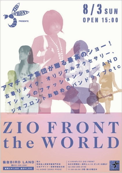 どーも、私のブランドBEGOYAも参加するイベントのお知らせです。 そしてここの管理人さんもモデルとして参加します☆ つ い に 開 催 !! ★★★★8月3日☆15:00〜★★★★ 〜ZIO FRONT presents〜 【ZIO FRONT the WORLD】 アーティスト集団がおくる 古着リメイク オリジナルアクセサリー オリジナルT-shirtのファッションショーも 今回で4回目!!!! ★参加ブランド★ ・Withch House ・go^ut ・sama ・30%orange juice ・SWEET HONEY DROPS ・Happy Toy ・PIXY