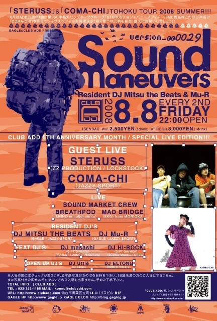 イベントの告知失礼します。 -every 2nd friday- GAGLE&CLUB ADD PRESENTS "SOUND MANEUVERS" ver.29 "CLUB ADD 5TH ANNIVERSARY MONTH / SPECIAL LIVE EDITION!!!" 2008.08.08(FRI) @CLUB ADD(SENDAI) 22:00 : OPEN W/F : 2,500YEN(1D) AT DOOR : 3,000YEN(1D) GUEST LIVE STERUSS(ZZ PRODUCTION / LOCKSTOCK) COMA-CHI(JAZZY SPORT) LIVE SOUND MARKET CREW BREATHPOD(MONO m.i.c&dj serita) MAD BRIDGE(SKD) from MORIOKA RESIDENT DJ'S DJ MITSU THE BEATS(GAGLE / JAZZY SPORT) DJ Mu-R(GAGLE / JAZZY SPORT) FE