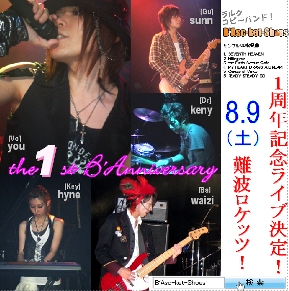 B'Asc-ket-Shoes Live情報!【7/12更新】 the 1st B'Anniversary EXPO 2008 出演 B'Asc-ket-Shoes(L'Arc-en-Cielコピー) Layn (GLAYコピー) 1周年記念ライブ! エンターテイメント盛りだくさん長時間のツーマンライブ 場所・日時 難波ROCKETS OPEN 17:00 START 17:30 アクセス http://www.namba-rockets.com/map/ 入場料 先行予約 ¥2,000 当日入場 ¥2,300 (1ドリンク\500別途必要です。) 先行予約方法 このトピックスにコメン