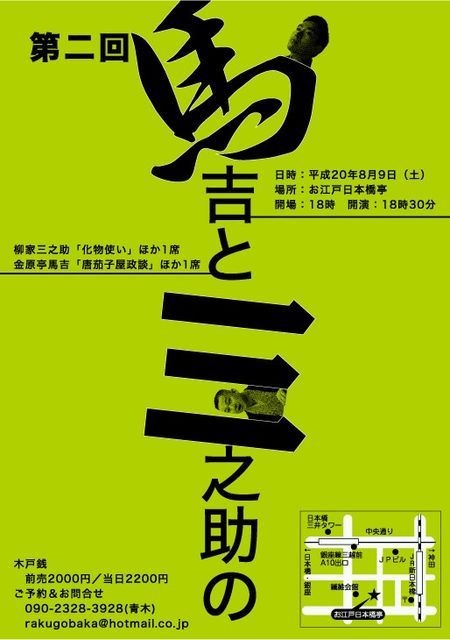 18時開場・18時30開演 前売2000円 当日2200円 予約・問い合わせ rakugobaka@hotmail.co.jp 三之助 「化物使い」 ほか一席 馬吉 「唐茄子屋政談」 ほか一席