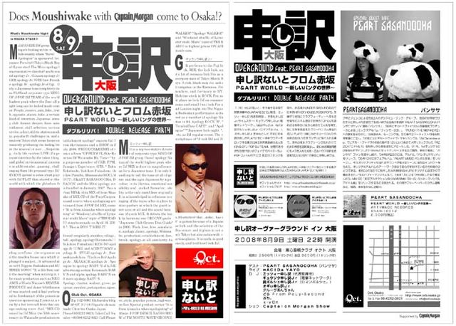 ○2008年8月9日(土) [ 申し訳 OVERGROUND feat. P&ART SASANOOOHA ]@大阪OCT. *申し訳ないとフロム赤坂とP&ART WORLD〜新しいパンダの世界〜のW Release Party* -DJ- ミッツィー申し訳 (代表取締役) ギュウゾウ申し訳Jr. (電撃ネットワーク) 掟ポルシェ申し訳Jr.(ロマンポルシェ。) オギぃ申し訳Jr. -SPECIAL GUEST- P&ART SASANOOOHA (パンダとササノハ) -GUEST DJ- グルーヴあんちゃん -SUPPORT DJ- どら from PoLy-Second ぷち。 k-y0n -LIVE- mACIDa YAYO [ http://macidayayo.com/ ] -VJ- RAM&MELON G___o
