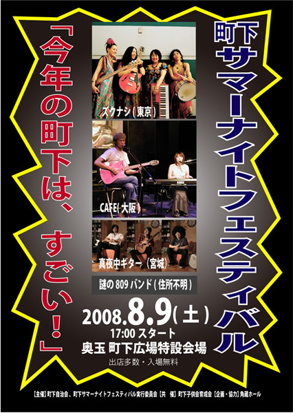 山と田んぼに囲まれた超ローカルな民区の広場で行われる地元民しか知らないマイナーなイベントですが、今年のゲストは「本当に、すごい!」ことになっています。近隣の方は元よりファンの方は必見ですよ! 【日 時】 2008年8月9日(土) PM5:00 スタート 【会 場】 一関市千厩町奥玉 町下広場特設会場 (地図→http://map.yahoo.co.jp/pl?type=scroll&lat=38.96171428&lon=141.36974539&sc=6&mode=map&pointer=on) ちなみに下方にある「ヤマザキ」は、角蔵ホールのあるところです。 【ゲスト】 ズクナシ(東京)http://zukunasi.c