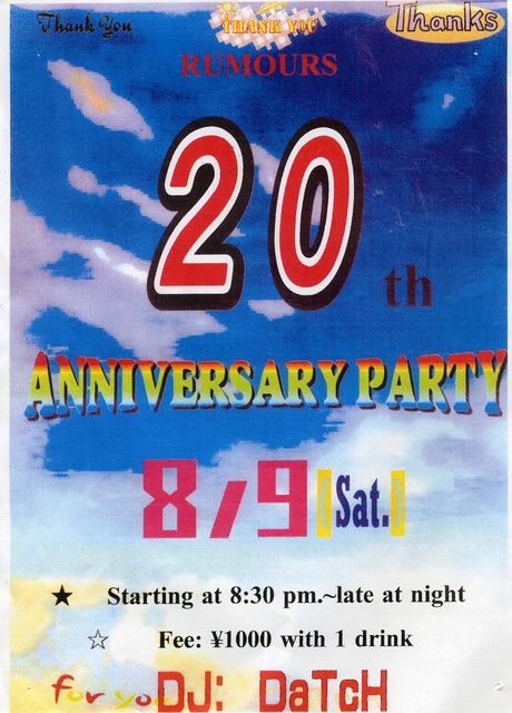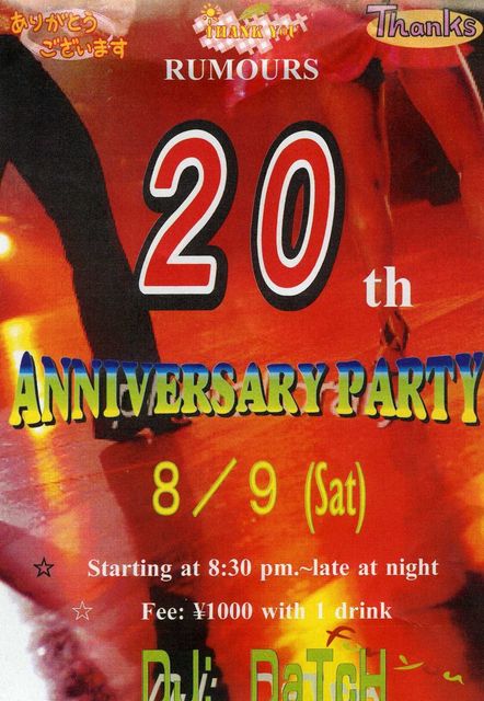 今年の梅雨も明けました。 ほんま暑いです。 車の窓を全開にして駐車していると突然の豪雨で猛ダッシュ!! ボクだけでしょうか? DaTcHです。 夏です! 祭りです! パーティーです!! 遂にRUMOURS!!創業20年でっせ これまで多くのお客様にご贔屓いただき愛され守られ共に 成長してきました! 懐かしいお客様&元STAFF大勢来られます☆ さぁ〜いきまっせ ☆20th ANNIVERSARY PARTY at. RUMOURS☆ http://g.pia.co.jp/shop/10551 F