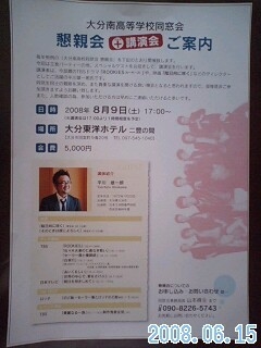 2期生のM崎先輩からの熱〜い告知です!! 8月9日の同窓会懇親会、17時からの記念講演は5期の平川君に決まりました! (大分東洋ホテル・二豊の間にて) 「陰日向に咲く」「そのときは彼によろしく」「ROOKIES」 「佐々木夫妻の仁義なき戦い」「セーラー服と機関銃」「白夜行」 「あいくるしい」「世界の中心で、愛をさけぶ」などの制作に 監督やディレクター等の立場でたずさわるという活躍ぶりです!! 当日は卒業から現在までの経緯や、現場での話などを聞きましょう! ↓平川君の紹介ページ http://www.web.crescendo.co.jp/st