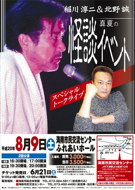 和歌山県海南市にて稲川淳二×北野誠の怪談ライブが開催されます。 詳細は下記の通りです。 8月9日土曜日 2回ステージ ?開場16:30〜開演17:00〜 ?開場19:30〜開演20:00〜 @海南市民交流センターふれあいホール(全席指定席) 前売3000円/当日3500円 6月21日13時より電話予約開始。 お問合せ:海南市スポーツ振興事業団073−484−5811 稲川淳二と北野誠の怪談トークライブです!