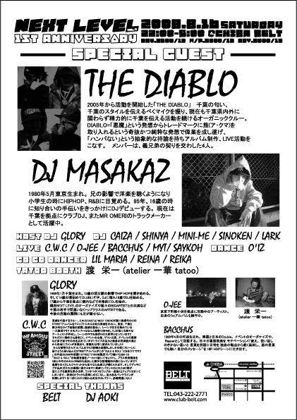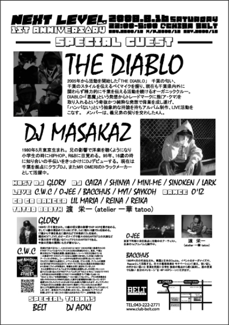 2008/8/16(土) HIPHOP,R&B 『NEXT LEVEL』 〜1st ANNIVERSARY〜 @千葉CLUB-BELT OPEN 22:00〜 GUEST DJ: ■MASAKAZ GUEST LIVE: ■theDIABLO HOST DJ: ■GLORY DJ: ■CAIZA ■SHINYA ■mini−me ■SINOKEN ■Lark LIVE: ■C.W.C ■O−JEE ■BACCHUS ■MYT ■SAYKOH DANCE: ■0’iz GOGO DANCER: ■LIL MARIA ■REINA ■REIKA TATOO BOOTH: ■渡 栄一(aterier一華tatoo)