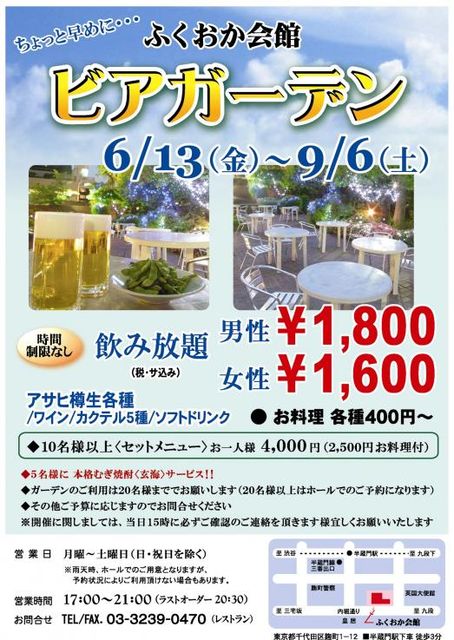 梅雨明け前から8月の予定を組んじゃいます 早めに企画をあげますので、ご都合をつけて一人でも多くの酔い子のご参加をお待ちしてます 酔い子の為の最適なビアガーデンを見つけました 17:00→ラスト21:00まで。。。。 飲み放題やったぁ〜 平日だと17:00スタートは難しいので今回は土曜日企画にしました。 4H飲み放題ですと、超素敵な酔い子に変身していると思います。 変身場所:ふくおか会館 東京都千