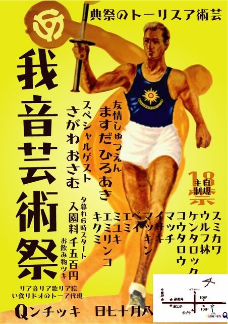 我音MASTERことケンタロウPRESENTs我音芸術祭 これヤバイヨね♪久々の我音・・・ドキドキだ さて詳細!↓↓ 夕方6時スタート入場1500円ドリンク付 出演 DJ&SINGER スミカワ ウルフ林 ケンタロック コウタロウ マッチ イサキ マッキン ベイ エミ ミユキ エミリンコ キクミ SPECIAL GEST さがわ おさむ 友情出演 ますだ ひろあき おもろいはずです!!! 保障します!!!(嘘やけど)笑 とにかく行くべし!!!!!!