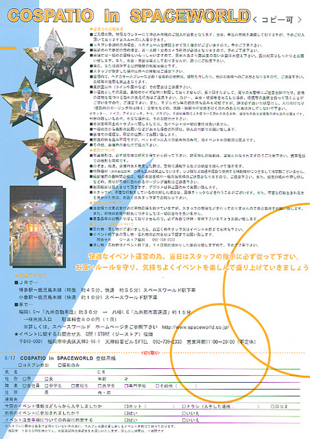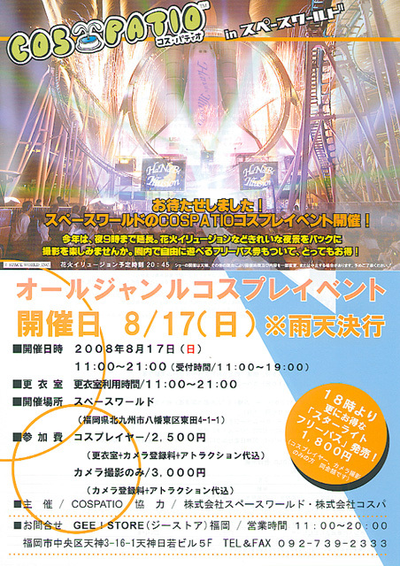 北九州のアミューズメントパーク「スペースワールド」でのコスプレイベント。 今年は、夜9時まで延長。花火イリュージョンなど、きれいな夜景をバックに撮影を楽しみませんか。 園内で自由に遊べるフリーパス券もついて、とってもお得! ■開催日時 2008年8月17日(日)11:00〜21:00(受付時間 11:00〜19:00)雨天決行 ※花火イリュージョン予定時刻 20:45 ショーの開催は天候、その他の理由により開催時間及び内容を一部変更、または中止する場合があります。予めご了承下さい。 ■更衣室 更衣室利用時間 11:00〜21:00 ■開催場