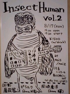 【Insect Human vol.2】 8/17(日) 19時開場 19時半開演 nois/noiz 福岡市中央区今泉1-23-4 新天神ビル205 tel.0927716789 1500円(1ドリンク付) 出演 ピラルク(from沖縄) 岡崎康洋(from蝉) 屠殺器