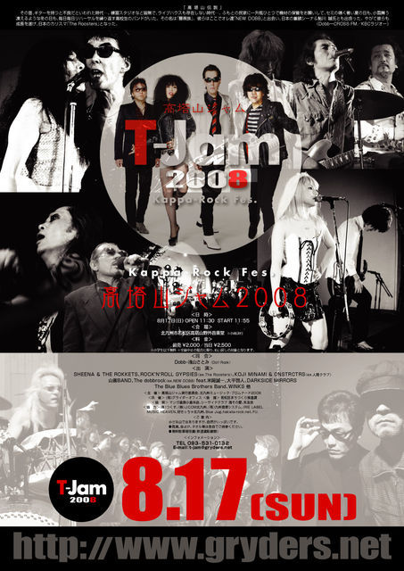 高塔山ジャム2008 〜T-Jam Kappa-Rock Fes. Vol.5〜 <日 時> 8月17日(日)※小雨決行 OPEN 11:30/PLAY 11:55 <会 場> 北九州市若松区高塔山野外音楽堂 <料 金> 前売り2,000円/当日2,500円(小学生以下無料) ※チケットぴあ、ローソンチケット他有名プレイガイドにて7/17発売開始予定 <司 会> Dobb・浅山さとみ(Do!! Rock) <出 演> シーナ&ザ・ロケッツ、ROCK'N'ROLL GYPSIES(ex.The Roosters)、KOJI MINAMI & CNSTRCTRS(ex.人間クラブ)、山善BAND、The dobbrock(ex.NEW DOBB)feat.米岡誠一