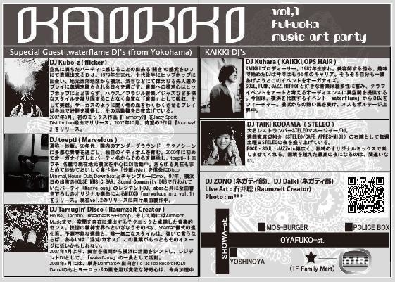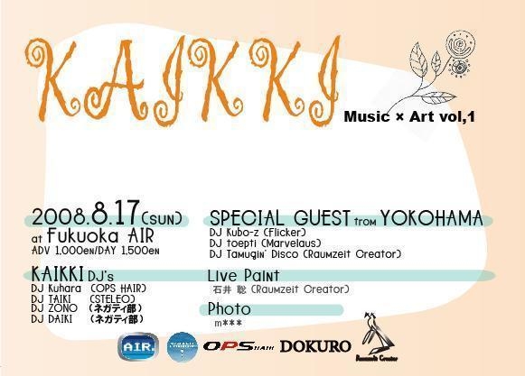 『KAIKKI』vol,1 2008.8.17(sun) @AIR(ファミマの左側の階段) adv.1000(1Dオーダー) day.1500(1Dオーダー) OPEN/START 21:00〜 ★SPECIAL GUEST from YOKOHAMA -waterflame- DJ Kubo-z(Flicker) toepti(Marvelqus) Tamugin(Raumzeit Crea tor) -KAIKKI- DJ Kuhara(KAIKKI,OPSHAIR ) TAIKI(STELEO) ZONO(ネガティ部) Daiki(ネガティ部) -Live Paint- 石井 聡(Raumzeit Creator) -Photo- m*** 『KAIKKI』ってカイキって読むんですよ。。 『KAIKKI』という