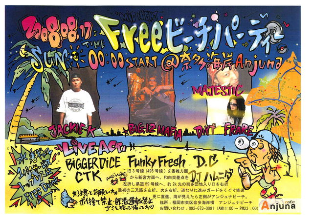 090ラーメンプレゼンツ “FREE ビーチパーティー” お昼の12時からスタート〜SUNSET 東区の奈多海岸を向かって左側のビーチ“Anjuna” 竹で作ったドームが目印★ エントランスFREE!!! 水着ギャル1drinkサービス!!! トップレスはFree Drink!!! LIVE BIG I'z MAFIA BIGGER DICE Funky Fresh CTK D.C DJ JACKIE-K MAJESTIC 〜シークレットゲストDJ〜 DJハムニダ etc… 豪華メンバーのLIVEがビーチで聴けるなんて!!!!! しかもエントランスフリー!!!!! 間違いなく、この日このビ