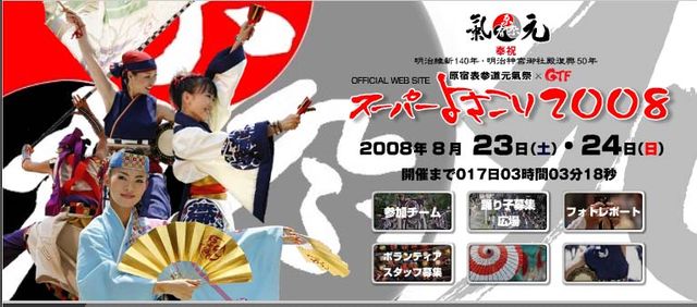 今年も開催されます、2008年スーパーよさこい http://www.yosakoi-harajuku.com/ 本場高知から14チームも参加しますね! チームで踊られる方 個人で、仲間で観戦に行かれる方 ございましたら、情報共有しましょう! わかめも観に行くよ〜(24日)