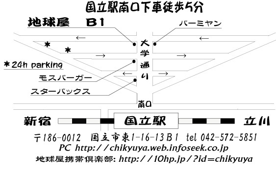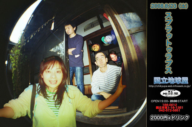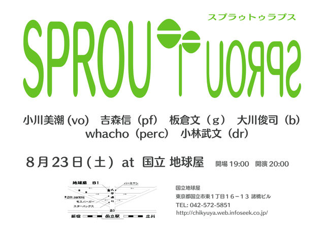 地球屋 国立駅南口下車徒歩5分 大学通り沿いです。 料理もお酒もおいしいお店。 焼き魚やざるそばも食べれます! スプラゥトゥラプス 小川美潮 v 吉森 信 p 板倉 文g 大川俊司 b whacho per 小林武文 dr OPEN19:00 START20:00 2000yen+1drink 50人限定 スプラゥトゥラプスブログ http://ohkawa.blogspot.com/ 地球屋HP http://chikyuya.web.infoseek.co.jp