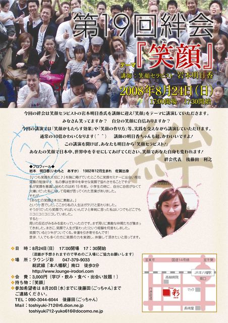 みなさんこんにちは! 絆会代表の後藤田です。 今回は私が毎月主催させていただいている絆会のご案内です。 ご興味ございましたらぜひ、遊びに来てくださいね。 絆会とは? 「一つの出会いが一生の絆になる」を合言葉に 『出会い』『学び』『イベント』の3つの要素をおりまぜながら 出会いや仲間の大切さを感じてもらう会です。 また、メンバー全てが仲間のために 自分のできる範囲で手を差し伸べてあげられる集団です。 そこから 『仲間がいれば大抵のことはできる」ということを学び 「メンバー全ての夢を応援し、実現すること