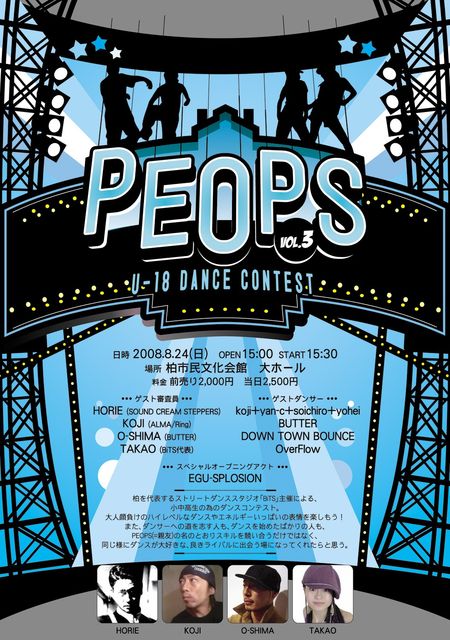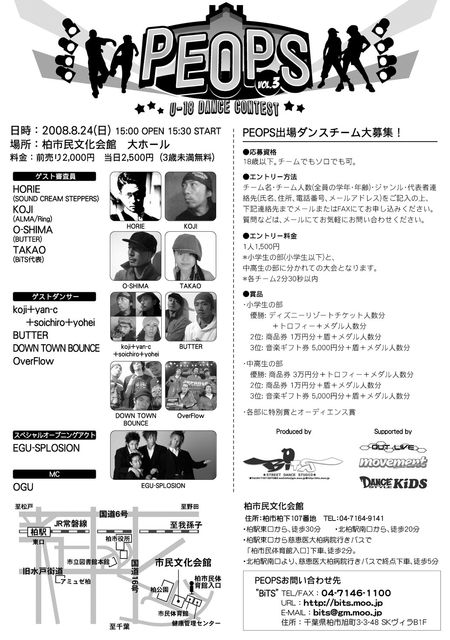 小中学生のためのダンスコンテスト 「PEOPS」 今回で3回目の開催となり、会場も今までの小ホールから大ホールに!! 超豪華なゲストパフォーマンスと審査員の方々。 又、今回から見ている皆さんの気持ちが反映できるよう、オーディエンス賞を設けました。 出場される方はもちろん、見に来てくださる方々にも楽しんでいただきたく思っています。 エントリー締め切りは8月22日(金)午後8時!! 詳細はこちら↓ =================== under18ダンスコンテストPEOPSvol.3 開催日 2008.8.24 (日)