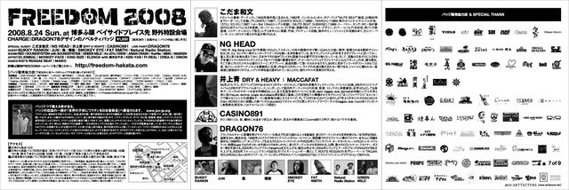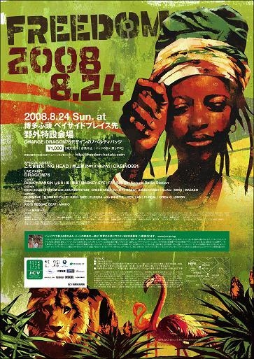 レゲエを中心とした野外イベントです。 『FREEDOM2008』 2008年8月24日(日) @博多ふ頭 ベイサイドプレイス 野外特設会場 地図 http://www.chizumaru.com/maplink.asp?SER=all&D=all&X=469437.285&Y=120966.272&SCL=795 14時〜21時半 ノベルティーバッチ1個で入場できます。 (※ノベルティーバッチ:1000円。dragon76デザイン。収益の一部を「世界の子供にワクチンを日本委員会に寄付させていただきます。) イベントの詳細・ノベルティーバッチの購入方法はコミュニティーでチェック。 「FREEDOM〜レゲエ夏祭り」
