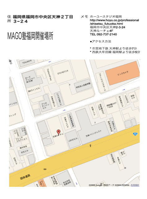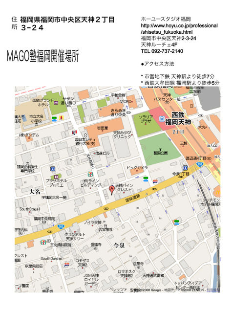 開催日時 8月25日(月曜日) 開催場所 ホーユースタジオ福岡 http://www.hoyu.co.jp/professional/shisetsu_fukuoka.html 福岡市中央区天神2-3-24 天神ルーチェ4F TEL 092-737-2140 ●アクセス方法 * 市営地下鉄 天神駅より徒歩7分 * 西鉄大牟田線 福岡駅より徒歩5分 時間 13:00〜16:00(延長17;00) 募集人数 多数 会費 未定 約 6000 円(講習用CD含む) 持ち物 MAGO-ROM CD2枚(参加者様へ事前送付)・ノートパソコン ※・ノートパソコンなくても大丈夫で